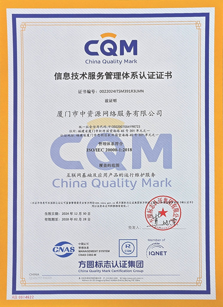 CQM信息技術(shù)服務(wù)管理體系認(rèn)證證書